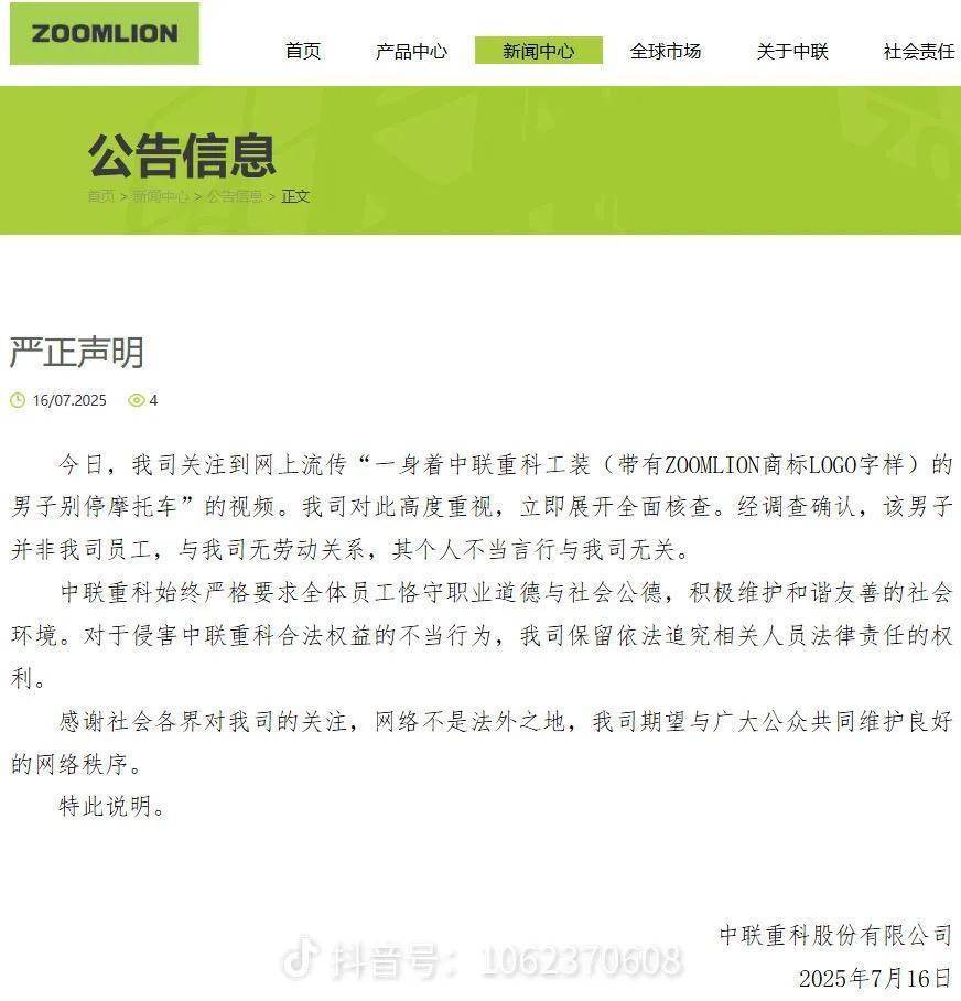 面对网友质疑,7月16日晚间,中联重科官方发文称,我司关注到网上流传“一身着中联重科工装(带有ZOOMLION商标LOGO字样)的男子别停摩托车”的视频。我司对此高度重视,立即展开全面核查。经调查确认,该男子并非我司员工,与我司无劳动关系,其个人不当言行与我司无关。与此同时,中联重科在声明中强调,对于侵害公司合法权益的不当行为,保留依法追究相关人员法律责任的权利。