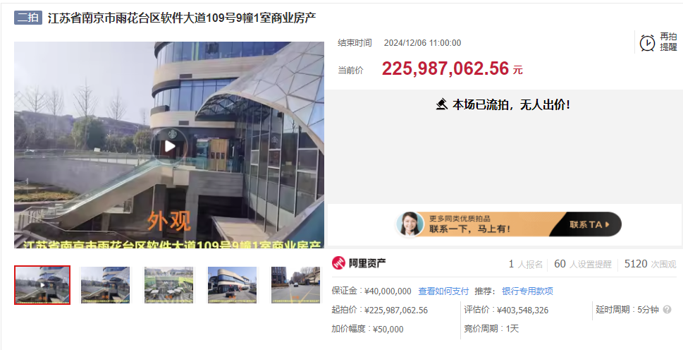 值得一提的是,2024年12月,该标的物进行二次拍卖,起拍价从2.82亿余元降到了2.25亿余元,相当于市场估价打半折拍卖,吸引了上千人围观,1人报名,但最终再次以流拍收场。