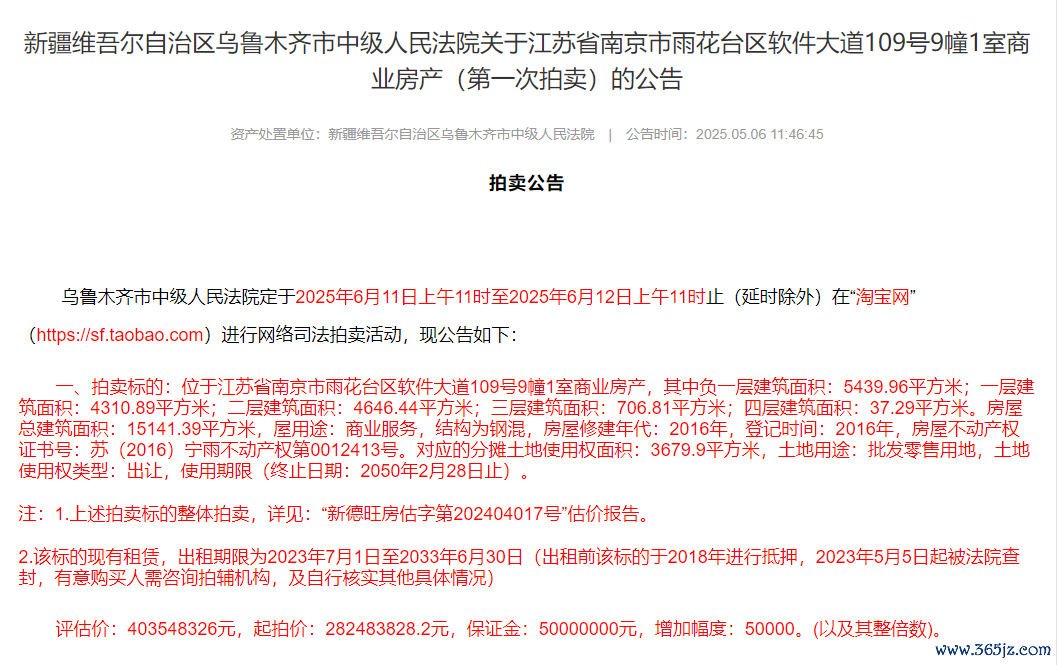 5月12日,现代快报记者了解到,雨花客厅E-park商场南区9幢商业房产再被乌鲁木齐市中级人民法院“上架”阿里资产交易网,并于6月11日进行网络司法拍卖。拍卖页面显示,待拍房产市场估价达4.03亿余元,起拍价直降超1亿元,相当于打“7折”,定为2.82亿余元拍卖。据此前报道,雨花客厅E-park商场9幢商业房产在去年一年间被多次拍卖,后均因无人出价流拍。