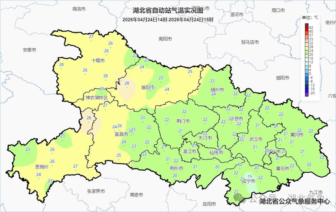 湖北省自动站气温实况图(4月24日14时至15时)